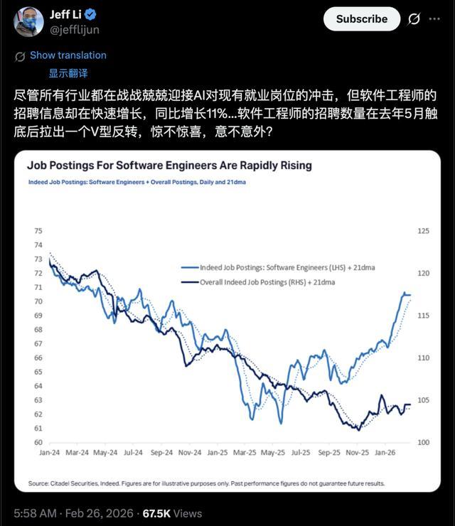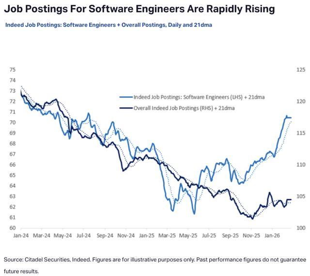 网友转发了Citadel Securities报告中软件工程师招聘数量,在去年5月触底后拉出一个「V型反转」,同比增长11%。
