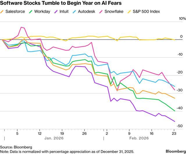 上图中,Bloomberg统计了2026年1月5日到2026年2月23日以来,美国软件巨头股价变动情况: