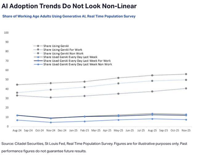 但真实情况是,数据出人意料地稳定:几乎没有任何证据表明AI在日常工作中的使用正在加速。