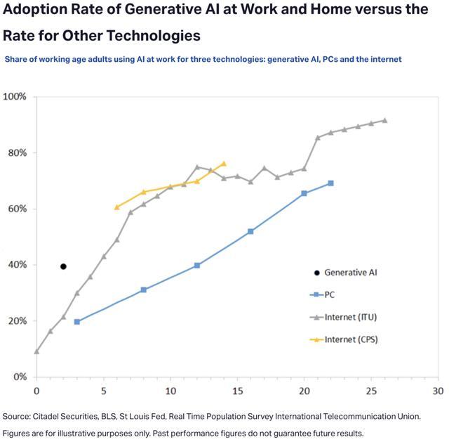 生成式AI与个人电脑及互联网的S曲线对比图